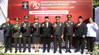 Denpasar, tvOnenews.com - Mengusung tema “Kemenkumham Mengabdi untuk Negeri, Menuju Indonesia Emas 2045”, Kantor Wilayah Kementerian Hukum dan HAM Bali sukses menggelar upacara bendera dalam rangka memperingati Hari Pengayoman ke-79.