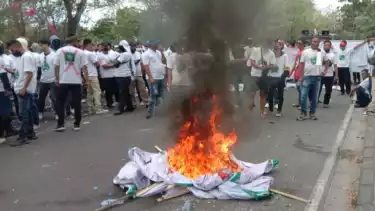 Mereka juga menerima yel-yel "Bubarkan Muktamar" dan membakar atribut spanduk dan bendera PKB.