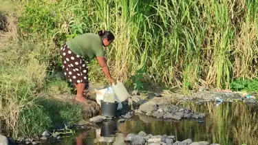 "Kami harus buat kubangan kecil agar bisa dapatkan air untuk minum dan masak," ungkap Theresia Suryani, warga dusun Mageloo ditengah kesibukan membuat kubangan di bantaran kali Magepanda, Sabtu (5/10/2024).
