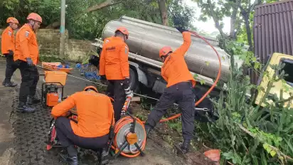 "Mereka sudah selesai melakukan pengisian air dan akan meninggalkan lokasi, namun karena kondisi jalan truk keluar jalur, dan mereka berusaha menstabilkan agar tidak terperosok," kata Juni Antara.