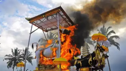 Walaupun ada ledakan dan kebakaran, masyarakat tidak terluka melanjutkan upacara ngaben massal hingga selesai.