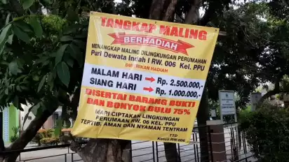 Tangerang, tvOnenews.com - Warga Perumahan Puri Dewata, Kelurahan Poris Plawad Utara, Kecamatan Cipondoh, Kota Tangerang, Banten, menggelar sayembara bagi masyarakat yang dapat menangkap maling. Bagi warga yang berhasil menangkap maling akan diberikan hadiah Rp2,5 juta.
