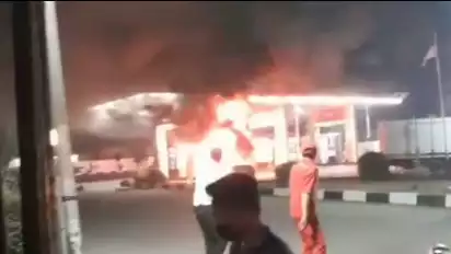 Beruntung, peristiwa itu tidak sampai ikut membakar SPBU. Terlihat petugas SPBU memadamkan api yang berkobar, sementara motor tampak ludes terbakar