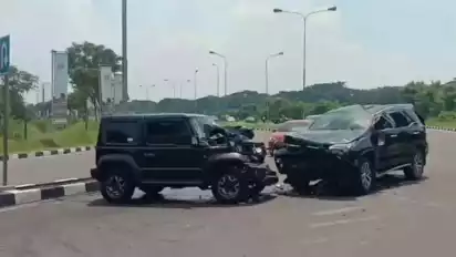 Tangerang, Banten - Tiga buah mobil terlibat dalam tabrakan yang terjadi di jalan Gading Serpong, Tangerang, Banten. Ada dua mobil mewah, yaitu sebuah kendaraan Toyota Fortuner dan Suzuki Jimny, serta sebuah taksi.