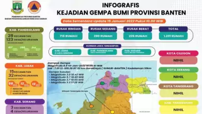 Pemerintah Provinsi Banten sedang melakukan update pendataan di tiga lokasi terdampak gempa, yakni Kabupaten Lebak, Kabupaten Pandeglang dan beberapa lokasi di Kabupaten Serang. Pemprov Banten juga melakukan penanganan kedaruratan.Berdasarkan data yang dihimpun BPBD Banten di Serang, Sabtu (15/1) sampai pukul 10.00 WIB, tidak ada korban jiwa dari kejadian gempa. Untuk jumlah bangunan rumah yang rusak di tiga daerah tersebut sebanyak 1.231 unit, dengan rincian 226 rusak berat, 290 rusak sedang dan 715 rusak ringan.Rumah rusak tersebut masing-masing di Kabupaten Pandeglang sebanyak 214 rusak berat, 269 rusak sedang dan 617 rusak ringan yang tersebar di 28 Kecamatan dan 123 desa.Sedangkan di Kabupaten Lebak 12 rumah rusak berat, 12 rusak sedang dan 98 rusak ringan yang tersebar di 15 Kecamatan dan 32 desa. Sementara di Kabupaten Serang terdapat 9 rusak sedang yang tersebar di 3 kecamatan dan 4 desa. Kepala Pelaksana (Kalak) BPBD Provinsi Banten Nana Suryana mengatakan bagi masyarakat yang terdampak kerusakan rumah, sampai saat ini masih mengungsi ke sanak saudaranya yang tidak terdampak. "Kita belum membuka tenda pengungsian, karena masyarakat masih memilih untuk menetap di rumah saudaranya," kata Nana.Selain kerusakan rumah, dampak gempa bermagnitudo 6,6 itu juga mengakibatkan sejumlah bangunan sekolah, kantor pelayanan serta tempat ibadah rusak.Di Kabupaten Pandeglang terdapat 13 sekolah, 14 Puskesmas, 4 sarana ibadah, 3 kantor pemerintahan, dan satu tempat usaha yang mengalami kerusakan.Sementara untuk Kabupaten Lebak ada 5 sekolah yang rusak, 2 fasilitas umum dan 1 kantor desa. Sedangkan di Kabupaten Serang tidak ditemukan kerusakan.