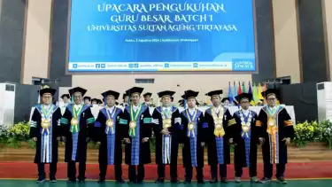 tvOnenews.com - Universitas Sultan Ageng Tirtayasa (Untirta) kembali menoreh capaian agung dengan bertambahnya Guru Besar di lingkungkan kampus. Kampus Jawara ini kembali mengkuhkan guru besar di antaranya Prof. Dr. Aceng Hasani, M.Pd., Prof. Dr. Agus Pramono, S.T., M.T., Ph.D., Prof. Maman Fathurrohman, S.Pd.Si., M.Si., Ph.D., Prof. Dr. Rudi Zulfikar, S.E., Akt., M.M., M.Si., Prof. Dr. Alimuddin, S.T., M.M., M.T., Prof. Dr. Jayanudin, S.T., M.Eng. Pengukuhan dilakukan di Auditorium Kampus Untirta, Sindangsari, Kecamatan Pabuaran, Kabupaten Serang, Sabtu 3 Agustus 2024.