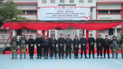 tvOnenews.com - Sebagai penegasan komitmen jajaran Kanwil Kemenkumham Banten untuk menjaga kelancaran serta antisipasi potensi gangguan keamanan selama Perayaan Natal Tahun 2024 dan Tahun Baru 2025, Kantor Wilayah Kementerian Hukum dan Hak Asasi Manusia Banten melakukan Apel Kesiapsiagaan di lingkungan Unit Pelaksana Teknis Pemasyarakatan Wilayah Banten, Senin (23/12/2024).