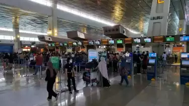 Terpantau di Terminal 3 Bandara Soetta, penumpang telah memadati area check-in untuk bersiap pergi berlibur. Senin, tanggal 16 Mei 2022, merupakan Hari Raya Waisak, sehingga banyak masyarakat yang memanfaatkan long weekend ini untuk berlibur.