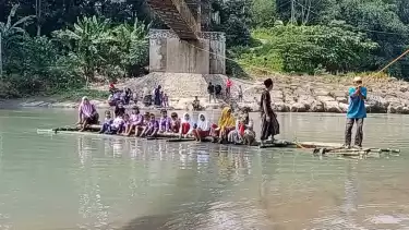Sling Jembatan Gantung Putus, Iroh dan Teman-teman Terpaksa Naik Rakit untuk Bersekolah