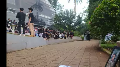 Depok, tvOnenews.com - Ratusan mahasiswa Universitas Indonesia (UI) berbagai fakultas menggelar aksi peringatan 8 tahun tewasnya mahasiswa FMIPA UI, Akseyna Ahad Dori di Danau Kenanga pada 26 Maret 2015 lalu. Massa menggelar aksi dengan berorasi dan teatrikal di Taman Perpustakaan UI, Beji, Jumat (31/3/2023).