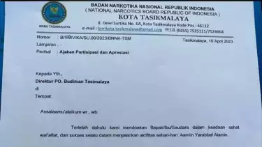 "Kami segenap keluarga besar Badan Narkotika Nasional Kota Tasikmalaya mohon partisipasi dan apresiasi bapak/ibu/ saudara untuk membantu berupa THR maupun paket lebaran untuk 28 anggota di lingkungan BNN Kota Tasikmalaya," bunyi kutipan bagian akhir dalam surat.