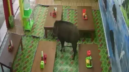 "kejadiannya hari minggu kemarin, nabrak bengkel dulu, warga terus teriak - teriak ada babi hutan turun gunung. Kemudian mondar mandir, lalu masuk ke kedai bakso,"kata Robika, pelayan kedai, Selasa (11/04/2023).