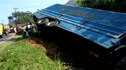 Warga lainnya, Aip (32) mengatakan, akibat kejadian itu, selain mengakibatkan seluruh muatan tumpah ke jurang, juga mengakibatkan tiang listrik dan tiang telepon tumbang.