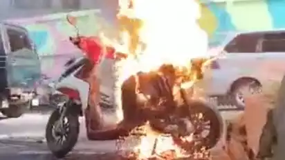 Bandung, tvOnenews.com - Motor seorang ojek online (Ojol) terbakar di Jalan Siliwangi, Hegarmanah, Kota Bandung, Jawa Barat, Kamis (10/8/2023).