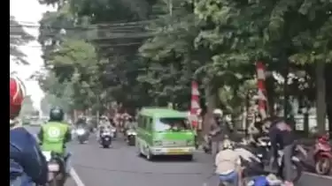 Beredar video seorang pemotor terjatuh dk Jalan Sudirman karena motornya terlilit kabel yang putus tersangkut bus. Korban tampak tidak mengalami cidera serius karena pemotor tersebut langsung melanjutkan perjalanan. (ekh/ade)