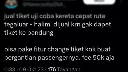 Bandung, tvOnenews.com - Tiket gratis Kereta Cepat Jakarta-Bandung (KCJB) atau Whoosh yang disediakan gratis untuk masyarakat, diperjualbelikan oleh oknum yang tidak bertanggung jawab dan viral di media sosial X (dulu twitter).