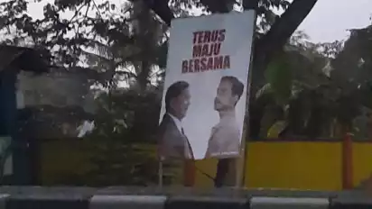 Dalam spanduk itu tampak foto Prabowo dan Gibran yang saling berhadapan dan 'Terus Maju Bersama'. Salah satu spanduk terlihat di depan RSUD MA Sentot Patrol.