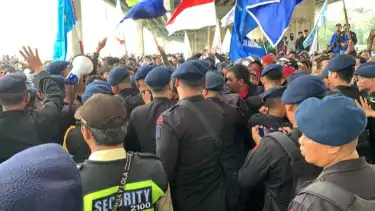 Petugas kepolisian dari Polres Metro Bekasi dan Brimob terlihat berjaga di lokasi. Mereka membentuk barisan untuk menghalau massa buruh yang rencananya akan masuk ke dalam tol.