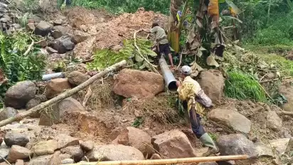 "Ini sekarang lagi beresin saluran air, tertimbun Longsor. Airnya buat aliran ke desa margamukti sekitar 7 hekrat sawah. Perbaikan sama warga, kalau ininya (pipa) beres bisa ngalir lagi," Ucap Imid, warga yang turut bergotong-royong memperbaiki saluran irigasi.