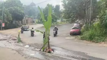 "Kami sengaja tanam pisang biar Pemerintah tahu. Selain itu pengguna jalan juga bisa menghindari lubang," ujar Aep warga sekitar.