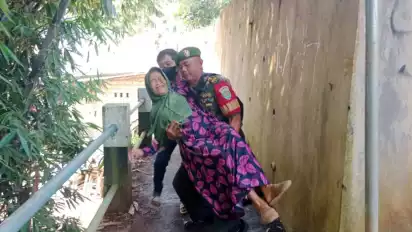 Bahkan seorang anggota Babinsa Kelurahan Cipaku terpaksa harus membopong seorang nenek karena lemas tidak kuat berjalan.