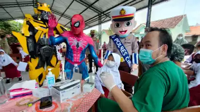 Cirebon, Jawa barat - Berbagai cara dilakukan agar menarik minat anak untuk berani disuntik vaksin covid-19. Salah satunya seperti yang dilakukan oleh Polresta Cirebon dan Dinas Kesehatan Kabupaten Cirebon, agar agenda pemberian vaksin menarik diikuti oleh anak, "Spiderman" dan "Bumble Bee" ikut hadir memantau pemberian vaksin.