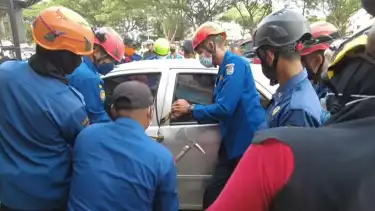Depok, Jawa Barat - Seorang bocah laki-laki berusia 4 tahun, terjebak di dalam mobil yang diparkir di depan sebuah minimarket di kawasan Boulevard Grand Depok City, Cilodong, Kamis (27/1/2022). Petugas Damkar pun dikerahkan untuk mengevakuasi bocah tersebut.