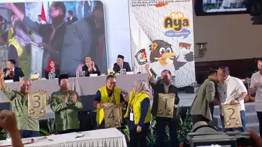 Bandung, tvOnenews.com - Komisi Pemilihan Umum (KPU) Kota Bandung secara resmi mengumumkan nomor urut bagi 4 pasangan calon di Pilwalkot Bandung yang akan digelar pada 27 November 2024 mendatang.