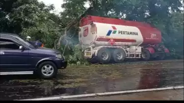 Ban Selip karena Jalan Licin, Truk Pengankut BBM Hantam Pohon