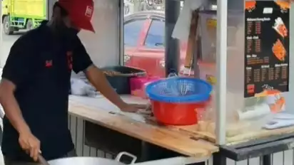 "ya blangsak, pokoknya blangsak pak, saya pakai minyak goreng sebagai bahan dasar jualan makaroni goreng, masa makaroni saya goreng pake air mentah," Kata Hakim kepada tvonenews.com, Senin (21/02/2022) di gerobak daganganya.