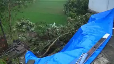 Pantauan Tvonenews.com di lokasi kejadian, tampak longsor dari tebing membuat pepohonan di bagi bawah bertumbangan. Gerusan longsor juga membuat atap garasi nyaris ambruk hingga harus dibongkar petugas.