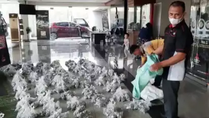 Endang dan istrinya datang ke salah satu showroom dengan membawa puluhan karung berisi koin Rp 500 yang dia kumpulkan.
