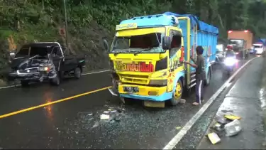"Truk melaju lajur kiri, dari sana arah Bandung ada mobil Pick Up hitam lawan arah akibat jalan licin dan langsung menabrak," kata Didi.