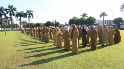 Tasikmalaya, Jawa Barat - Para Aparatur Sipil Negara (ASN) di lingkungan Pemerintah Kota (Pemkot) Tasikmalaya sudah mulai masuk bekerja, pasca-cuti lebaran idul fitri. Para ASN di lingkungan Pemkot Tasikmalaya itu, sudah memulai apel di halaman Bale Kota Tasikmalaya, Senin (9/5/2022).