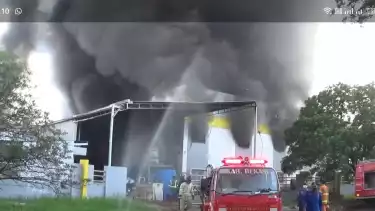 Bekasi, Jawa Barat - Kebakaran hebat melanda sebuah pabrik plastik milik PT Multi Usage Indonesia di Jalan Jababeka XII B, Kawasan Industri Jababeka, Kecamatan Cikarang Utara, Kabupaten Bekasi, Jawa Barat, Senin (16/05/2022).