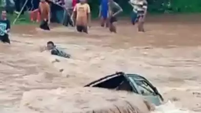 Upaya evakuasi pun berjalan dramatis, mereka yang terjebak hampir terseret luapan sungai hingga kendaraannya tergerus derasnya air.