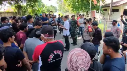 Indramayu, Jawa Barat - Puluhan warga desa Balongan dan desa Sukaurip, kecamatan Balongan, kabupaten Indramayu. Mendatangi PT kilang pertamina internasional (KPI) refinery unit VI Balongan di kabupaten Indramayu.