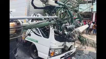 Satu unit mobil boks ikut tertimpa tiang telekomunikasi yang roboh usai ditabrak truk nyelonong itu.
