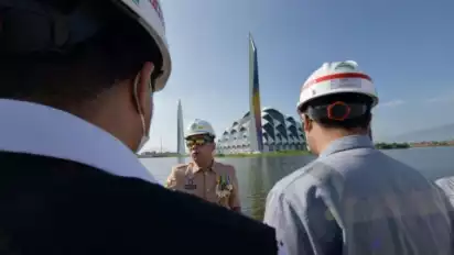 Gubernur menekankan kepada pekerja pengerukan danau yang mengelilingi bagian luar masjid.