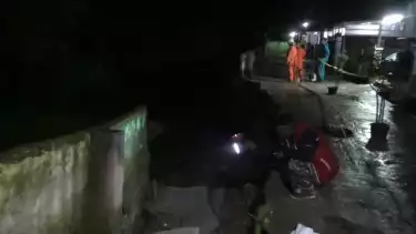 Kabupaten Sumedang, Jawa Barat - Akibat tidak kuat menahan debit air sungai yang deras, Tembok Penahan Tebing (TPT) sepanjang 25 meter longsor di kawasan Lingkungan Perumahan Grand Padasuka Blok D RT 03 RW 06, Desa Padasuka, Kecamatan Sumedang Utara, Kabupaten Sumedang, Jawa Barat, Senin (24/10/2022) malam.