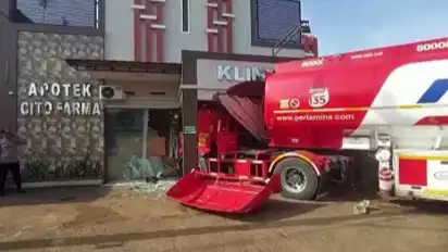 Kemudian, truk tangki Pertamina oleng dan akhirnya menabrak sebuah bangunan klinik dan apotek.