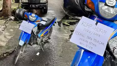 “KUHP HUKUM SYIRIK/KAFIR. Perangi para penegak hukum setan QS 9:29,” bunyi tulisan yang ditempel di sepeda motor berwarna biru itu.