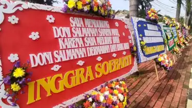 Salah seorang warga, Oden Kumis, mengatakan Karangan bunga dukungan terhadap Doni Salmanan ini datang sejak pagi hari.