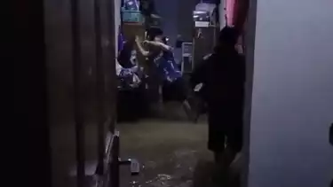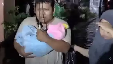 Warga Puncang Sawit sedang evakuasi bayinya saat rumahnya dilanda Banjir.