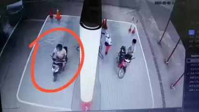 Bukannya pindah, pengendara sepeda motor tersebut justru meraih sesuatu lalu pergi begitu saja. Mengetahui itu, petugas SPBU kemudian berlari mengejar pengendara sepeda motor tersebut.