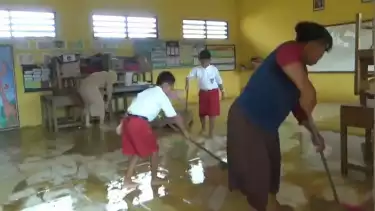 Para siswa- siswi mulai dari kelas 1 sampai kelas 6 nampak ceria membantu membersihkan sisa lumpur akibat banjir. Meskipun kondisi lantai menjadi licin, siswa tak canggung dan justru senang karena bisa belajar secara tatap muka.
