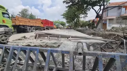 Pati, tvOnenews.com - Kemacetan panjang akibat pengecoran jalan pantura di daerah Batangan, masih terjadi di jalur pantura timur Pati, Jawa Tengah, Minggu (2/4/2023).