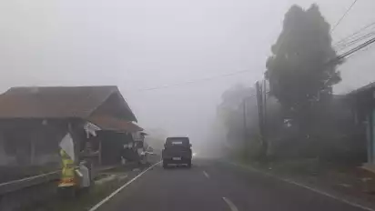 " Disana juga sering turun kabut dan hujan dalam waktu bersamaan. Untuk itu penting sekali digunakan kendaraan yang prima dan bila dimungkinkan pakai lampu kuning agar cahaya tidak menyebar saat kabut tebal turun," imbuh Kasatlantas.