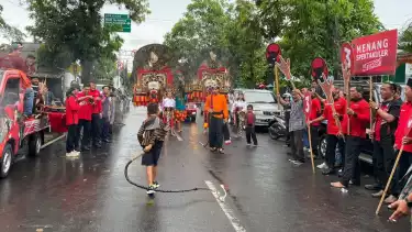 Semarang, tvOnenews.com - Sebanyak 50 bakal calon legislatif (bacaleg) dari PDI Perjuangan Kabupaten Semarang diarak berjalan menuju KPU Kabupaten Semarang dengan diiringi kesenian reog, Kamis (11/5/2023).