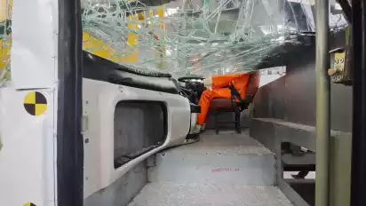 " Kita sebelumnya telah mengadakan simulasi uji tabrak ini. Dan hasilnya menunjukkan situasi ketika bagian depan bus depan tertabrak, kerangka pada bagian depan bus tidak masuk ke dalam dan dilindungi oleh absorber sehingga dapat menjamin keselamatan dari pengemudi," jelasnya.